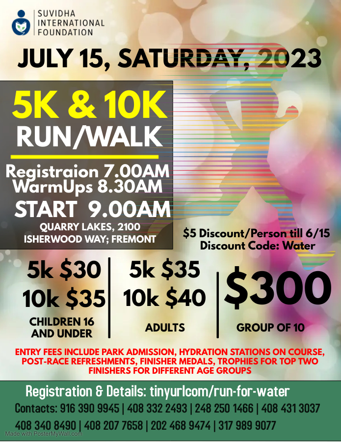 Suvidha International Foundation is inviting your family and friends to join 5K/10K walk/run to support the water projects and have fun. Art of Living Foundation administers the River Rejuvenation Water Projects in India. The additional details of projects are available Here.
